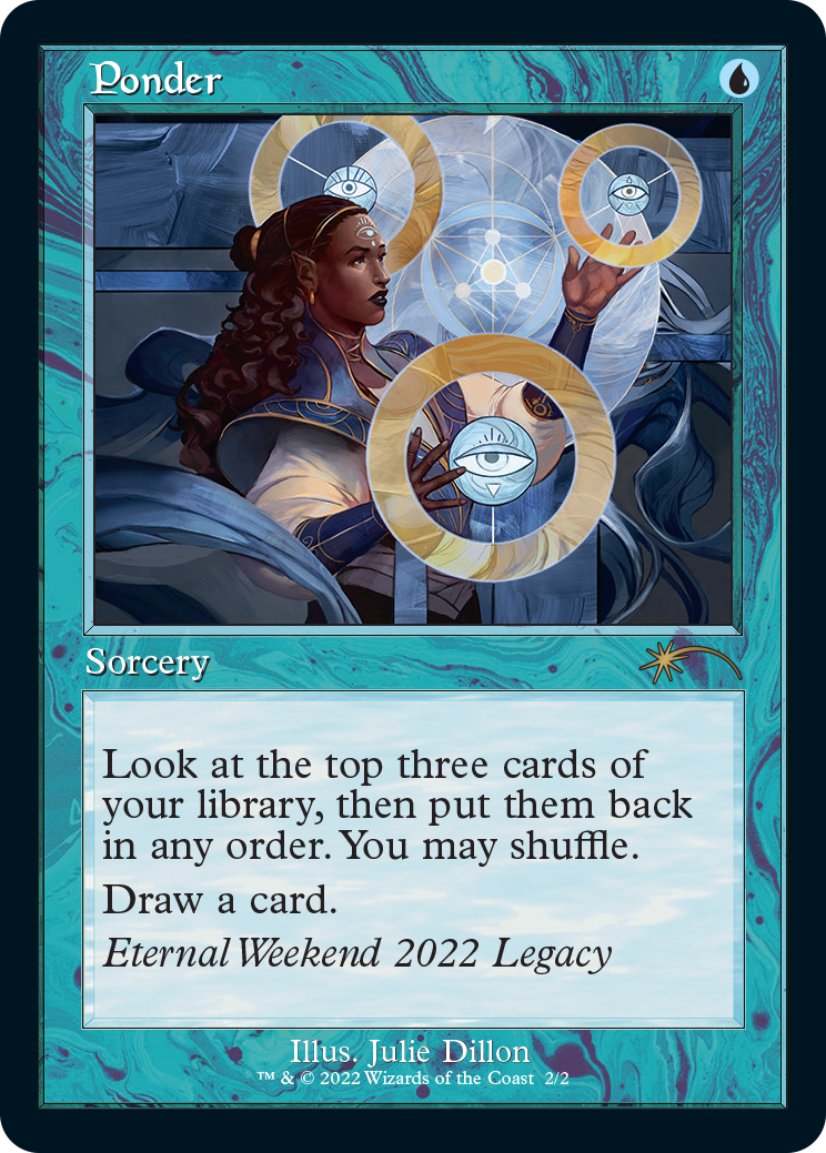 Top 8 players of the Legacy Championship on Magic Online will also receive a physical version of the Ponder promo. Likewise, the Top 8 players from the Vintage Championship on Magic Online will also receive the physical version of the Gush promo.
