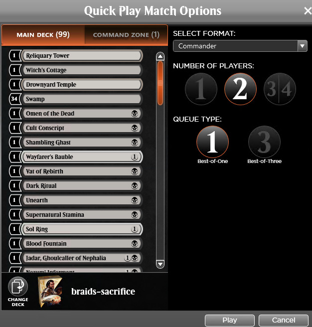 Choose your format and deck, how many players, how many games for the match, then click ‘Play.' You'll then be joined to a match or waiting for someone to join.