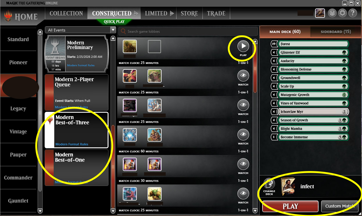 Once your Constructed deck is built, there are several ways to play casual matches with friends or other Magic Online players: