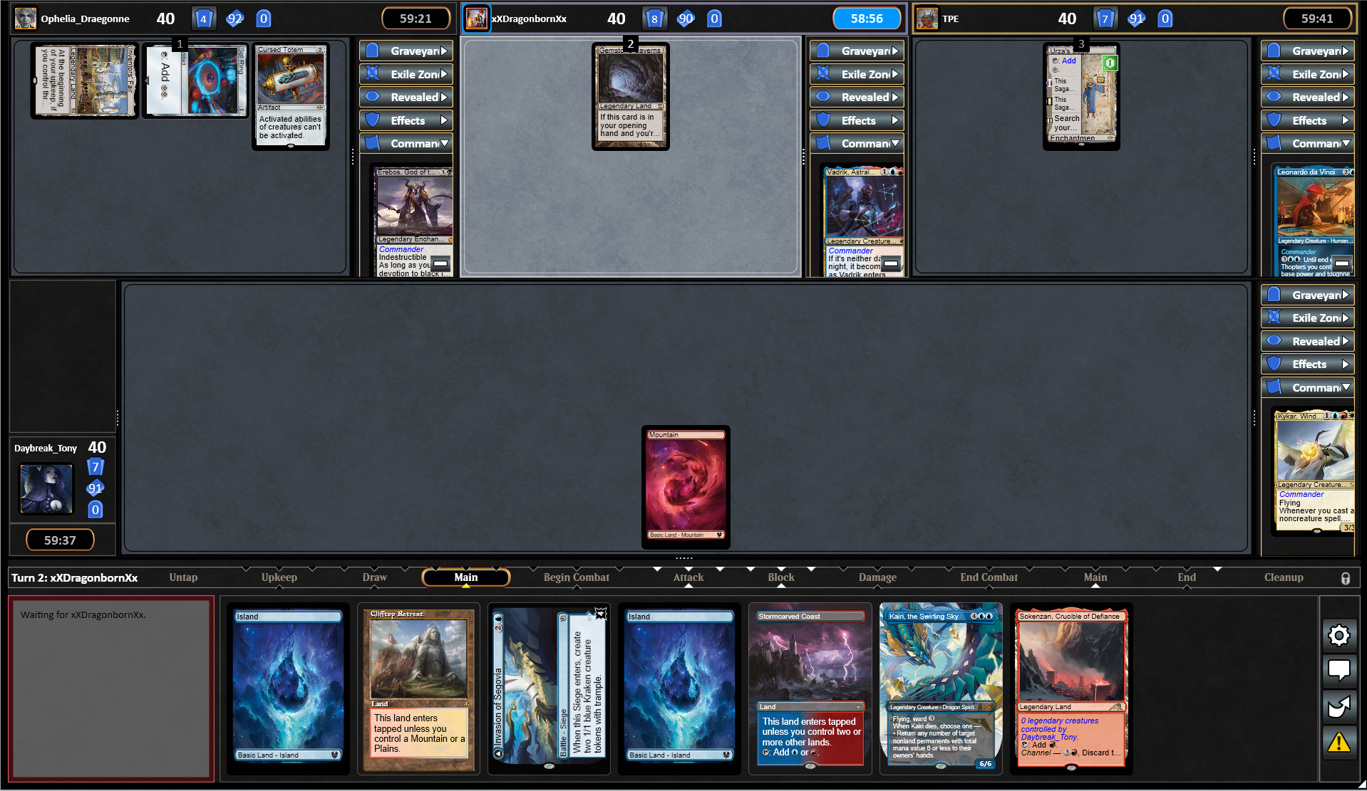 Your battlefield is in a similar position, while your opponents are split across the top half of the screen. Zones do not pop out, but instead can be toggled open or closed. Your graveyard is duplicated on the left side above your avatar for ease of use. Settings, Chat, etc are found at the bottom-right beside your hand.