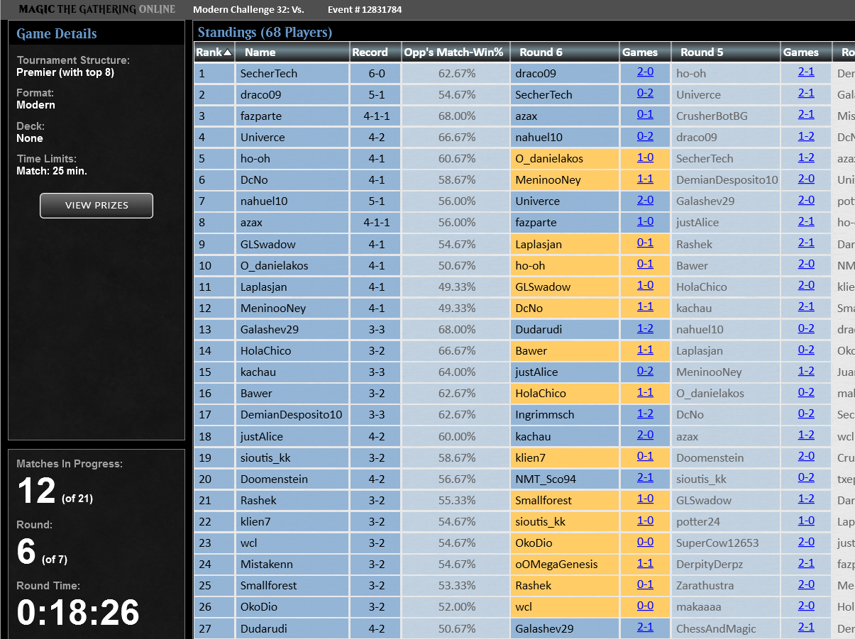 Unlike Leagues, each round of a Scheduled Event ends as soon as the last match is completed. The Event Details screen tracks how many matches remain, and which players are involved (highlighted in yellow). While a round is in progress, the standings entering the current round are shown with players listed in order of tiebreakers. Standings aren’t updated until all matches in a round are finished.