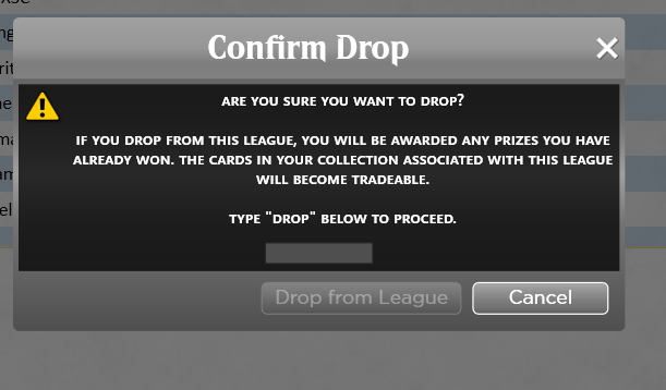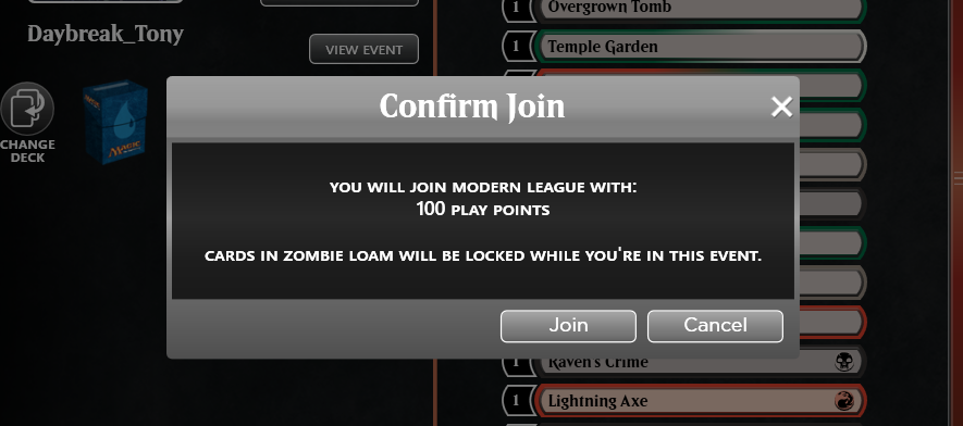 Before joining, check out how much time remains in the League. Click your preferred entry option and click Join on the confirmation pop-up. Cards in an active event are locked from list changes or trading until you finish playing in that League or tournament (whether by dropping or the event ending on its own).