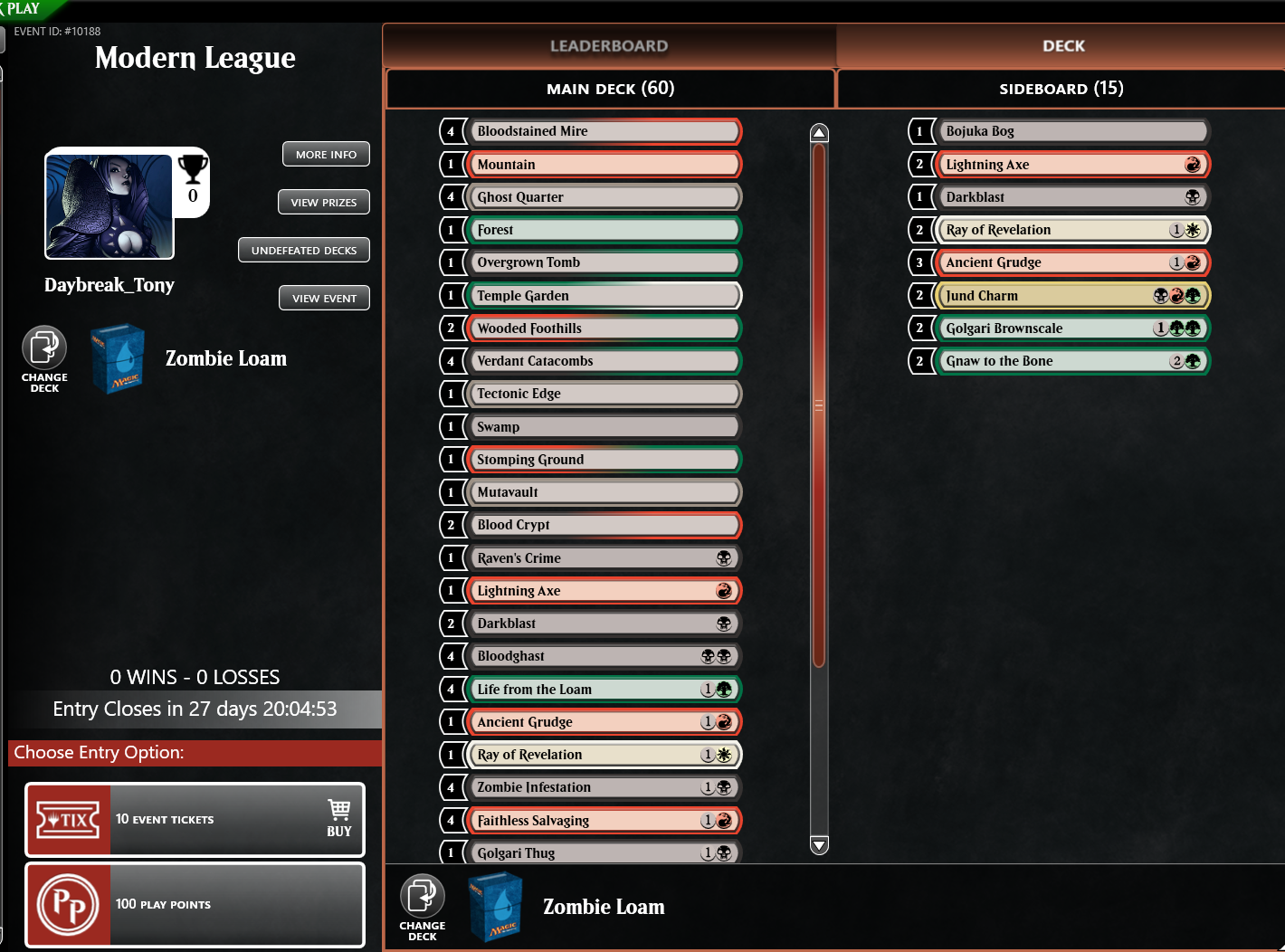 To join a Constructed League, start in the Play Lobby, then choose Constructed, and then click any event listed as a League. Select your deck and visually confirm any late changes to it from Collection in the Play Lobby.