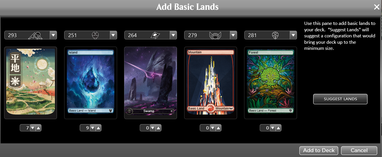 To add basic lands, choose the Add Basic Lands button. You can choose to use the set's default lands, or you can choose to use lands from your Collection with your favorite art! The picker will suggest an amount of lands to get to the minimum deck size, and it will consider all mana symbols in your main deck. So if you want to exceed 40 cards in normal Limited or are playing an off-color card, double-check your lands prior to submission.