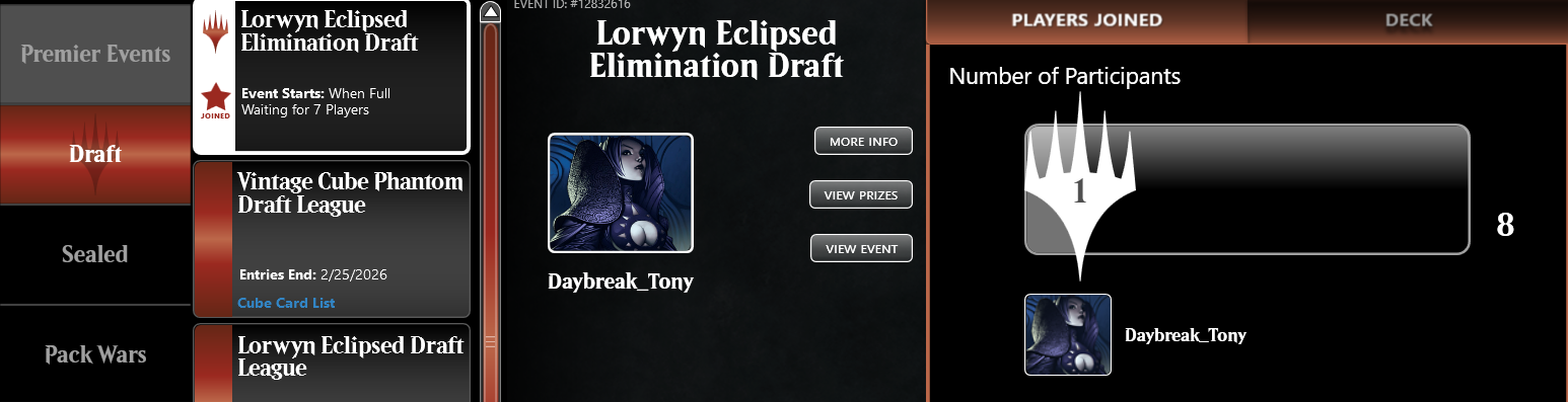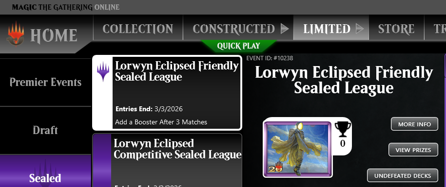 - For Constructed Events, ensure your deck in its proper configuration (main deck, sideboard and quantities) in the Collection scene and also in the right side of the Play Lobby before clicking the entry option.