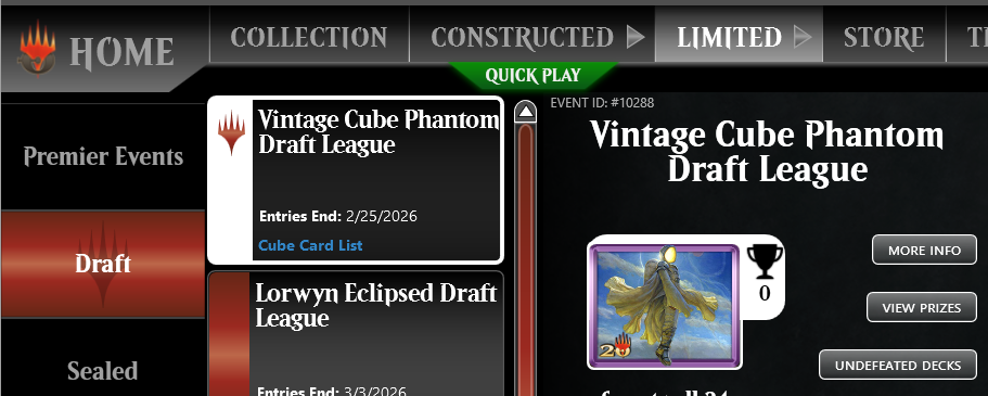 Some events are labeled as Phantom – they allow you to enjoy a play experience with the cards, but those cards are not added to your collection at the end of the event. All Cube events are offered as Phantom. If you want to play in events that build your collection, make sure you don’t select Phantom events.