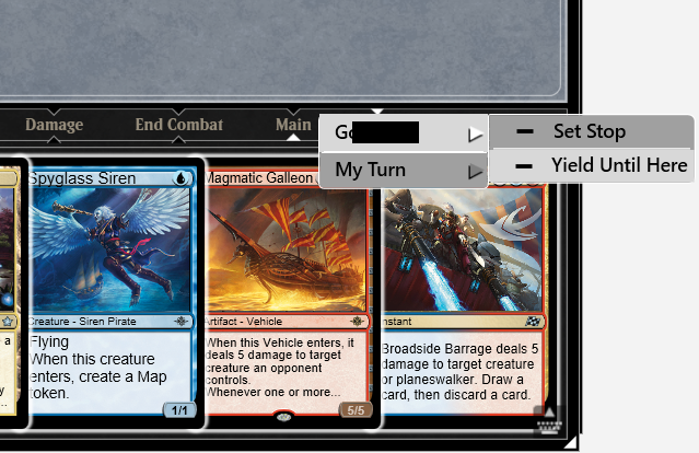 Yield Until Next End Step: Choosing this from the Options menu (right-clicking within the battlefield/clicking gear icon) will pass priority until the current turn’s End of Turn step – regardless if you have the stop set of not!