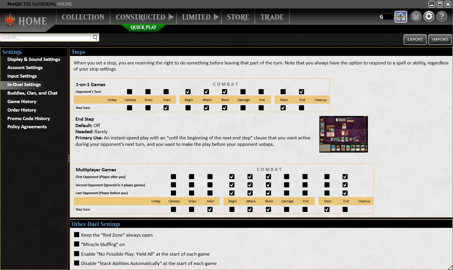 Before a Match Begins: Click on the Account tab at the top, then In-Duel Settings on the left. Toggle the arrows on and off to set stops – the opponent’s turn on top, your turn on bottom – and use the links provided for each game step to determine what works best for you.
