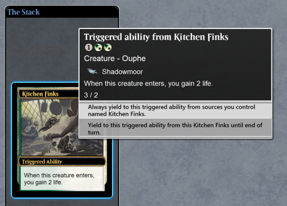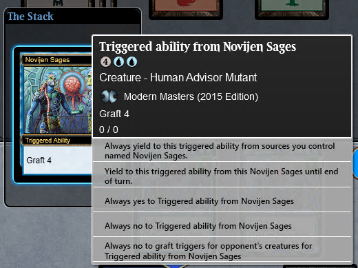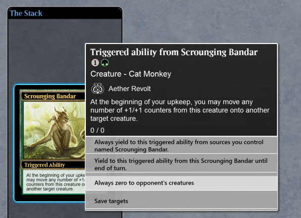 Say you control a trigger that could help your opponent’s creatures because you don’t currently have any creatures on the battlefield. While that trigger is on the stack, right-click it to access the extra options available to avoid aiding your opponent and to save clicks later: