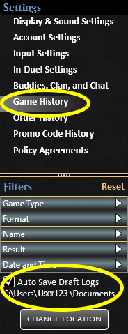 Want to go back and check your picks for each pack in a Magic Online draft event? Before the event begins, click the box shown below in the Account scene to have a text output of your draft saved to your computer. Use the Change Location button if you want to alter the file path on your machine. The log will show the cards that were available in each pack you reviewed, which cards you reserved, and which cards you selected.