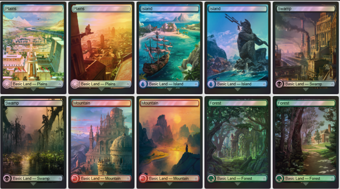 Add 10 foil copies of each of the 10 ACR basic lands – 100 cards in all – for just $9.99 USD. These lands feature silhouettes of assassins throughout the game’s history.