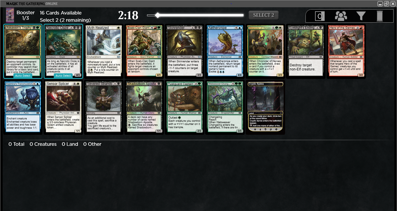 The draft portion itself involves you joining a pod with seven other players and you each have three packs with 15 cards each. Once the queue has eight players, the first pack opens and you pick a card out of which will go into your pool of cards that you can build your deck from after the draft. After a card is selected, the pack is passed to your neighbor on your left at the virtual table. In turn, you will see a new pack with one less card in it. This process is repeated until you have 15 cards, then the next pack is opened with picks passing the opposite direction. Repeat the procedure once more for the third pack and end up with 45 cards in total.