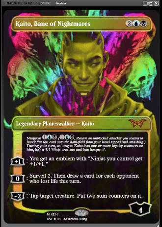 While the full upgrade won’t make it to Magic Online until later this year, we incorporated the WUP masks manually in some of the custom premium treatments that will be available with Duskmourn. Let’s take a look at these new effects, and when we get to examples incorporating the WUP, we will show you what the effect would look like without it using our current foil effect.