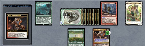 And here’s Chris doing the Mightform Harmonizer + Nadu, Winged Wisdom trick and swinging for lethal (3 triggers was all it took):