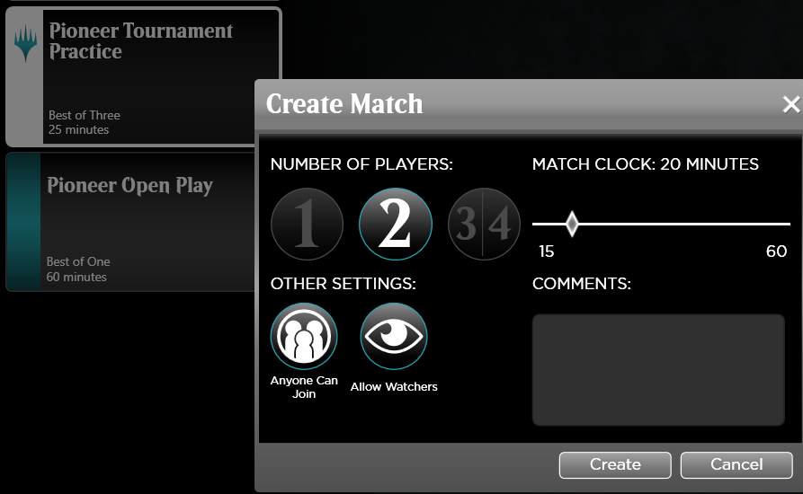 You will be able to select the number of minutes each player receives when setting up Open Play, Tournament Practice, and Buddy Challenge matches! And for the first time in MTGO’s history, you'll be able to shift between 15 and 60 minutes in increments of five.