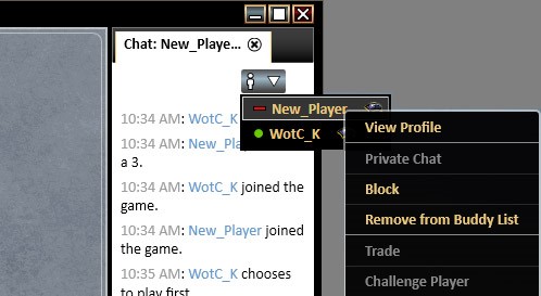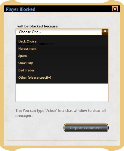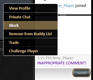When you're in the client, you can block disruptive or toxic players. A blocked player cannot join your Open Play games, initiate a chat with you, or start or join one of your trades. In addition, you don't see their chat when you are in the same channel (such as if you were paired for a match in a tournament).