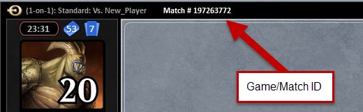 - Game ID (the Game ID or Match ID where the violation occurred) – This will help us review the issue and provide access to additional information we can use to determine the correct action to take. The Game ID or Match ID can be found at the top of the Duel Scene.