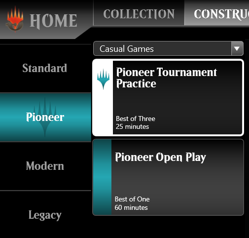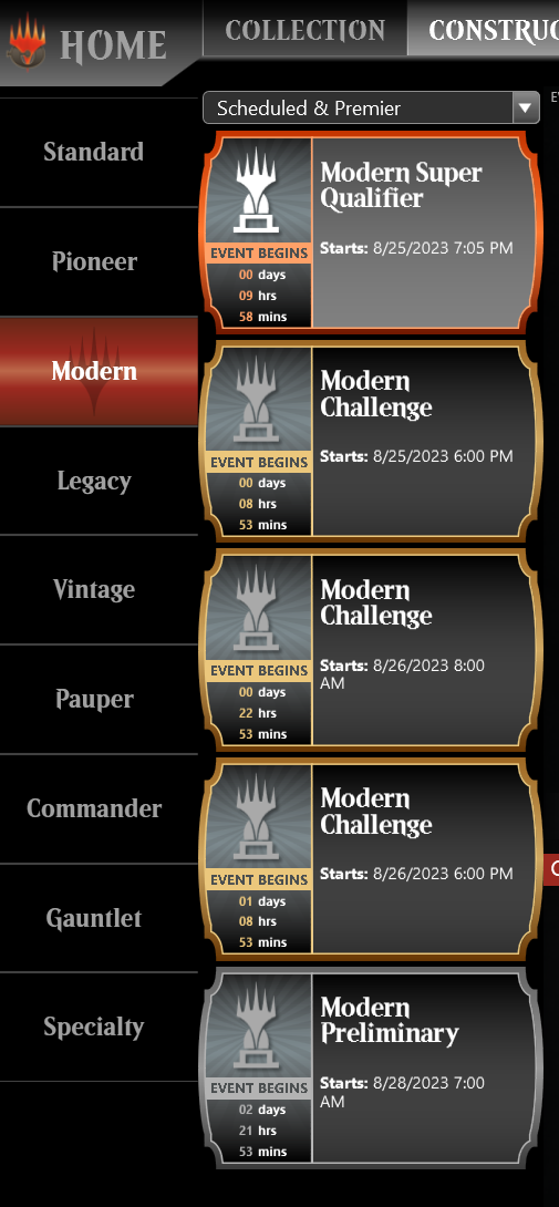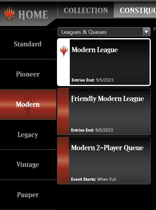 To make it easier to find the type of Constructed match or event you’d like to play, we’ve added a dropdown that allows you to filter by event type! After selecting an applicable format in the Constructed scene, you’ll notice a drop-down menu above the event list that allows you to choose between All Events, Scheduled & Premier, Leagues & Queues, and Casual Games.