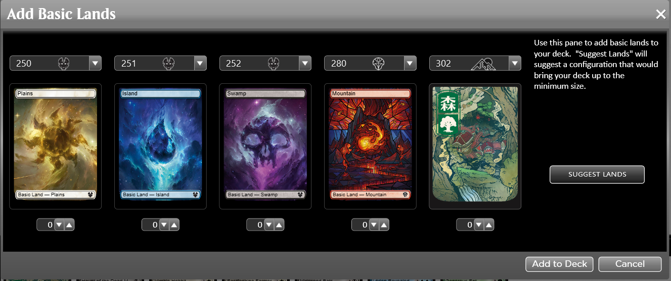 When it comes to Constructed deckbuilding, you’ll want to right-click in the pane where you’re building a deck and select “Add Land to Deck.” Adding a higher quantity of a specific version than what’s available in your collection triggers the tool to substitute the shortfall with other versions of the respective basic land that are present in your collection. Version preference is stored (Constructed deckbuilding only) for the next time you use the “Add Land to Deck” button when deckbuilding.