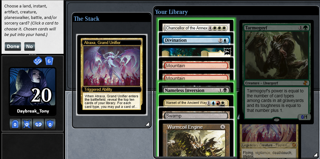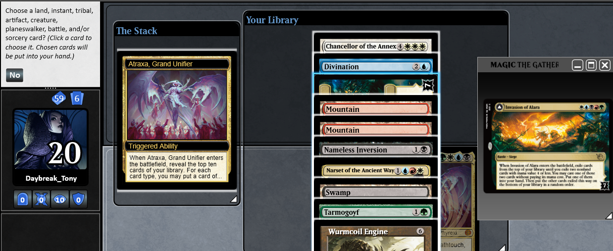 We improved the user experience for this potent creature. Now when you reveal the ten cards, the types available appear in the prompt box. Once you have a maximized set of card choices, they auto-highlight. From there you can swap cards of the same type. When you’re done selecting, click ‘Done.’ (Clicking ‘No’ passes through the entire trigger without selecting anything, so click carefully!)