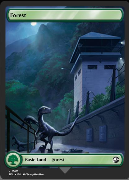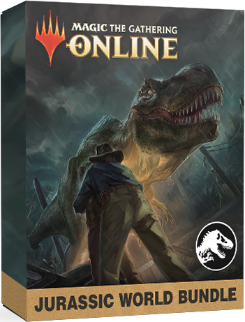 A special collaboration with one of the largest and best-known film franchises in history is on the horizon – the Jurassic World Bundle on MTGO! This digital box contains 20 brand-new card designs featuring dinosaurs, characters, and settings that have entertained millions for over 30 years. All of your favorites are here – the iconic Tyrannosaurus Rex, the massive Mosasaur, Ian Malcolm, Owen Grady (partnered with Blue), plus many more.