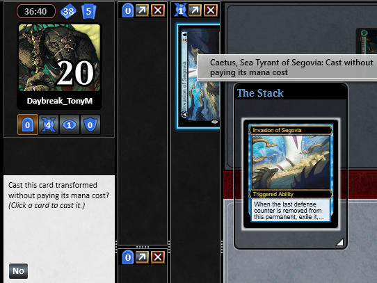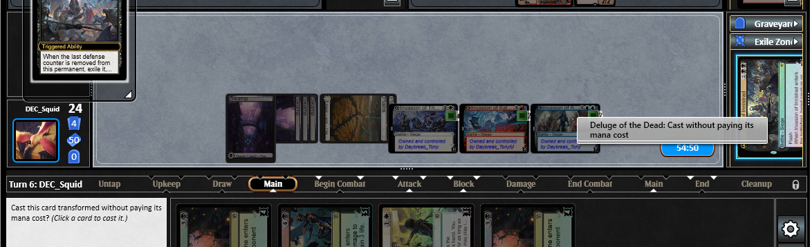 When a Battle is defeated, the card is first exiled and then cast from exile. Here’s how it can appear in MTGO – the important part is to open your Exile zone and click the highlighted card itself: