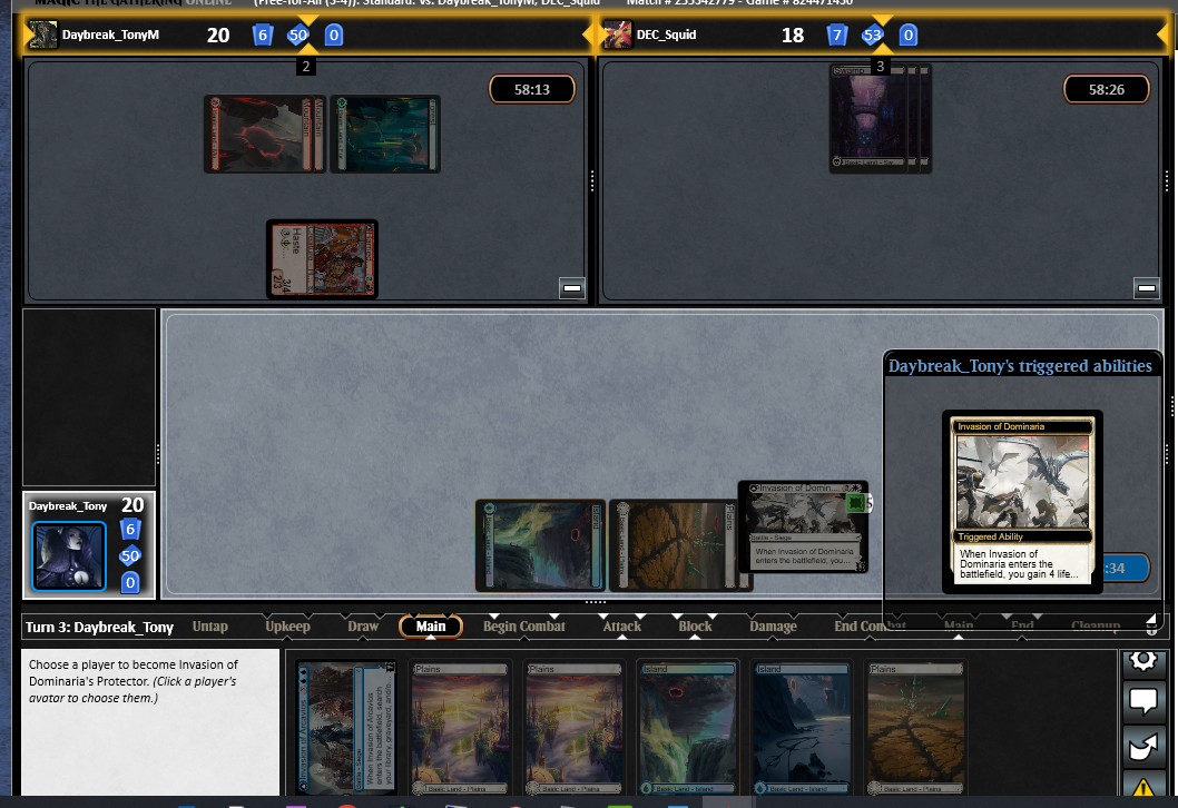 The most important thing to remember: You control the battle even though it is being protected by an opponent! For example, Invasion of Ixalan gets cast, then when it resolves it shows up on the opponent’s battlefield. In a multiplayer game, you first choose a protector before that Battle’s trigger goes onto the stack.