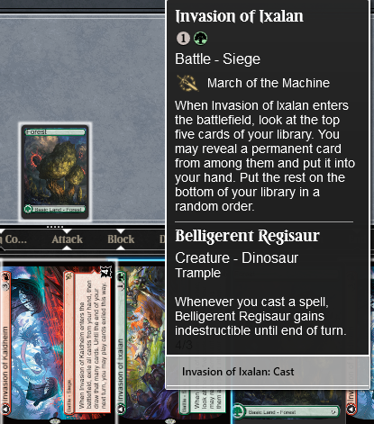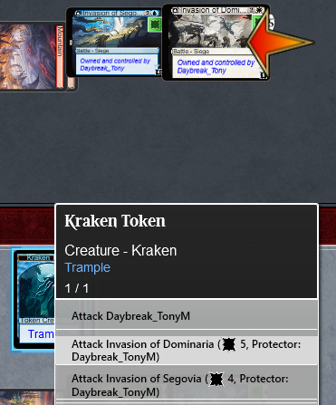 So when you attack an opponent who is protecting a Battle, you will get a menu similar to when you’re attacking a planeswalker or multiple opponents. Be especially careful if you are attacking two Battles with the same name!