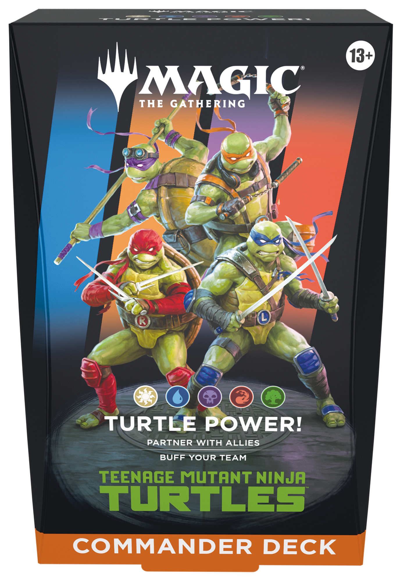 The Turtles gather together for a trip through 90’s video arcade nostalgia in the Turtle Power! Commander Deck. Featuring six different face commander options plus a powerful set of Commander combinations with the Character select option, this five-color feast will blow your mind! This deck will sell for $39.99 USD in the Magic Online Store starting next Tuesday.